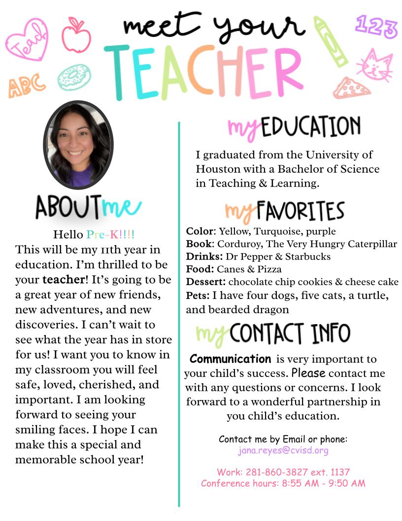 My name is Jana Reyes. I'm thrilled to be your Pre- K teacher. I received my degree from the University of Houston in 2014. This will be my 11th year in education. I am the proud mother of two wonderful baby boys. I enjoy spending my time with my family ever moment I can get. If you have any questions, please feel free to contact me.